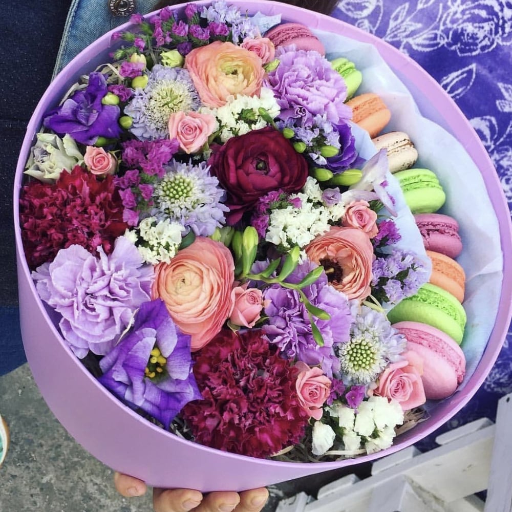 Сладкий подарок по любому поводу для ваших родных и любимых. Микс сезонных цветов в подарочной коробке с набором макарун.