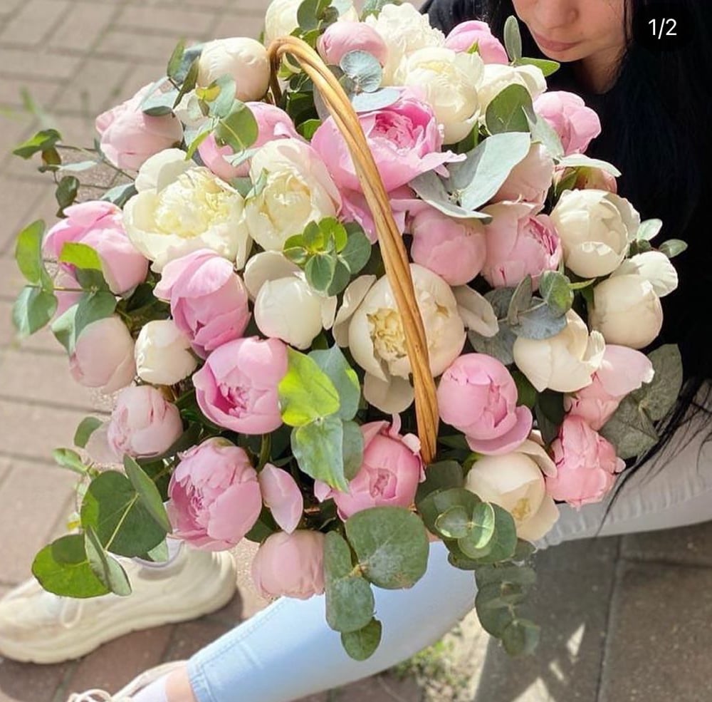 Корзина с пионами выражает таинственность и загадочность.