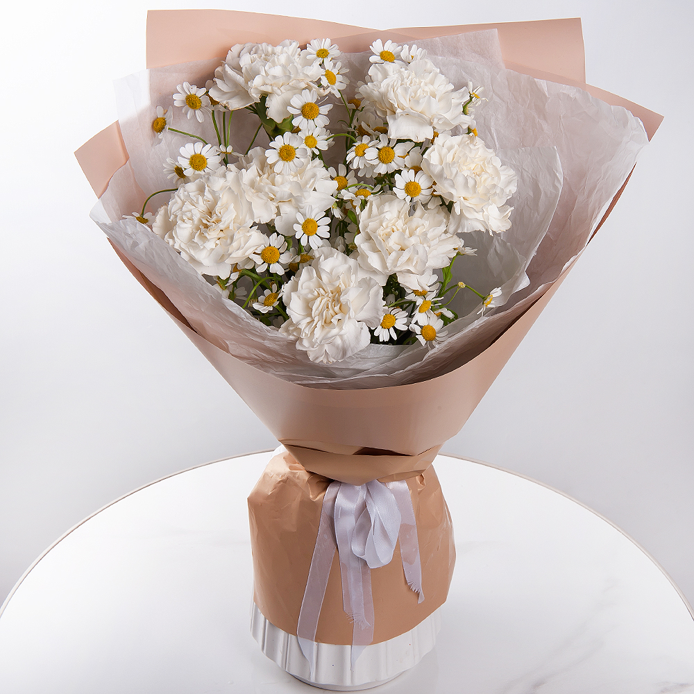 Букет «Танец облаков» из гвоздик и ромашек