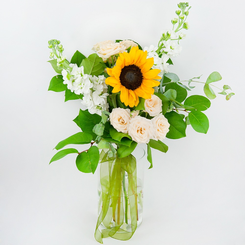 Beautiful and mysterious, this bouquet of sunflowers, creamy spray roses and fragrant mattiola in midnight blue matte paper will make a perfect gift for any celebration!
