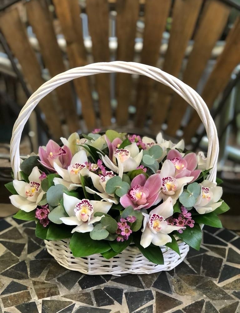 Композиция из нежных орхидей, восковника и эвкалипта.