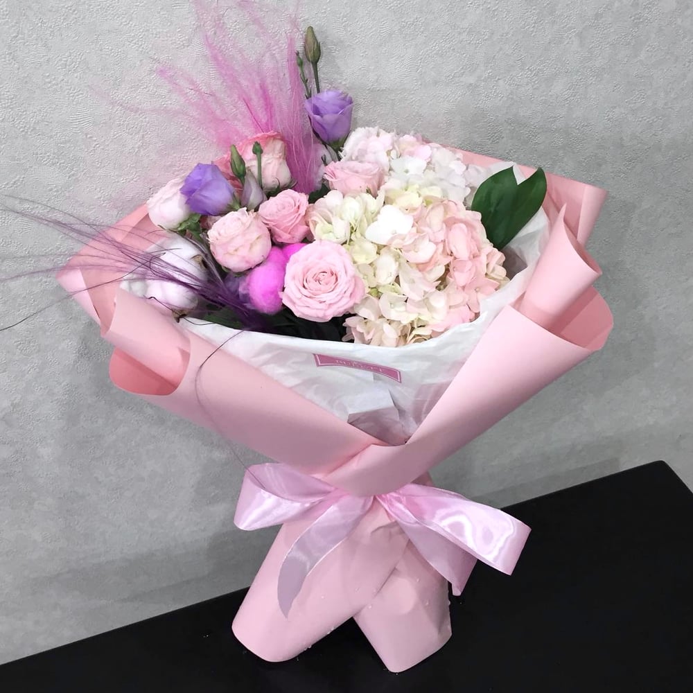 Состав Гортензия короелвская - 2 куст. Роза кустовая пионовидная - 4 шт. Хлопок - 2 шт. Эустома - 2 шт. Ковыль - 2 шт. Дизайнерская упаковка - 1 шт. Лента атласная - 1 шт. Бант атласный - 1...