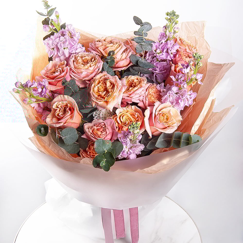 Нежный и романтичный букет из кремовых роз и пышных пионов, прекрасно дополняемых ароматной маттиолой и серебристым эвкалиптом. Упакованный в стильную упаковку и перевязанный атласной лентой, этот бу…