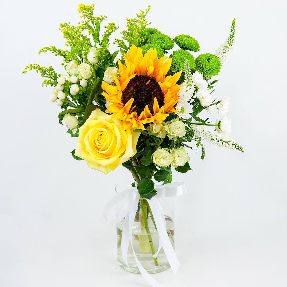 A cute bouquet of golden sunflowers, roses, chrysanthemums and hypericum will remind you of the summer warmth and will transfer you to sunny days and fill your heart with pleasant memories.