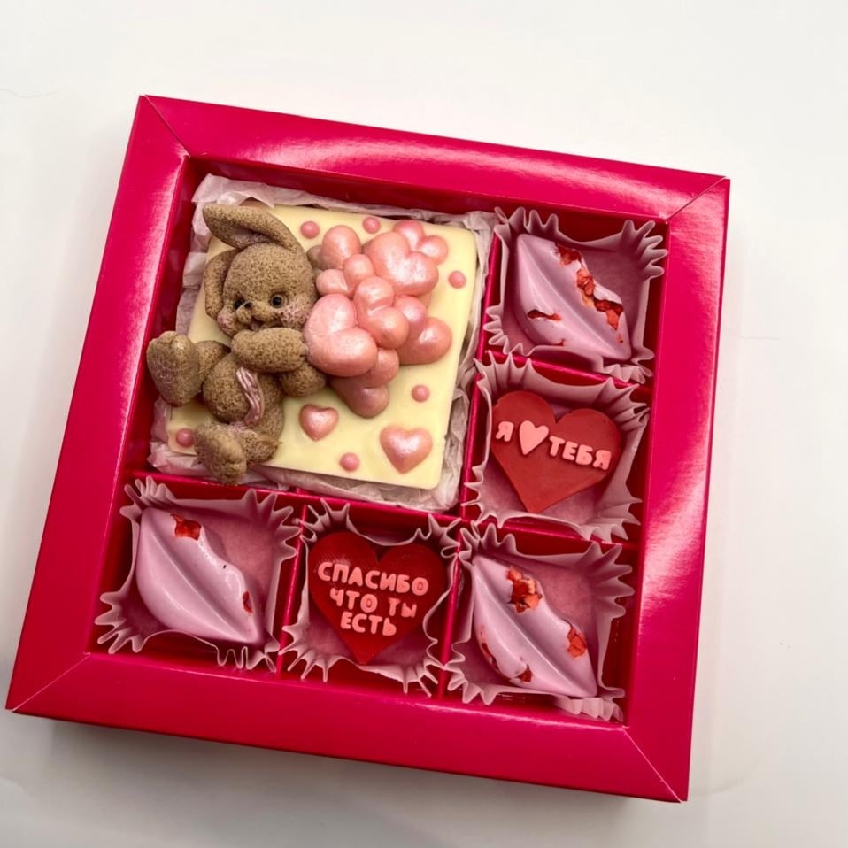 Набор шоколадный на День влюбленных. В наборе: 1 шт.фантазийная плитка 2 шт.шоколадные губы 2 шт.шоколадные сердечки с надписью Открыточка с вашими пожеланиями в подарок
