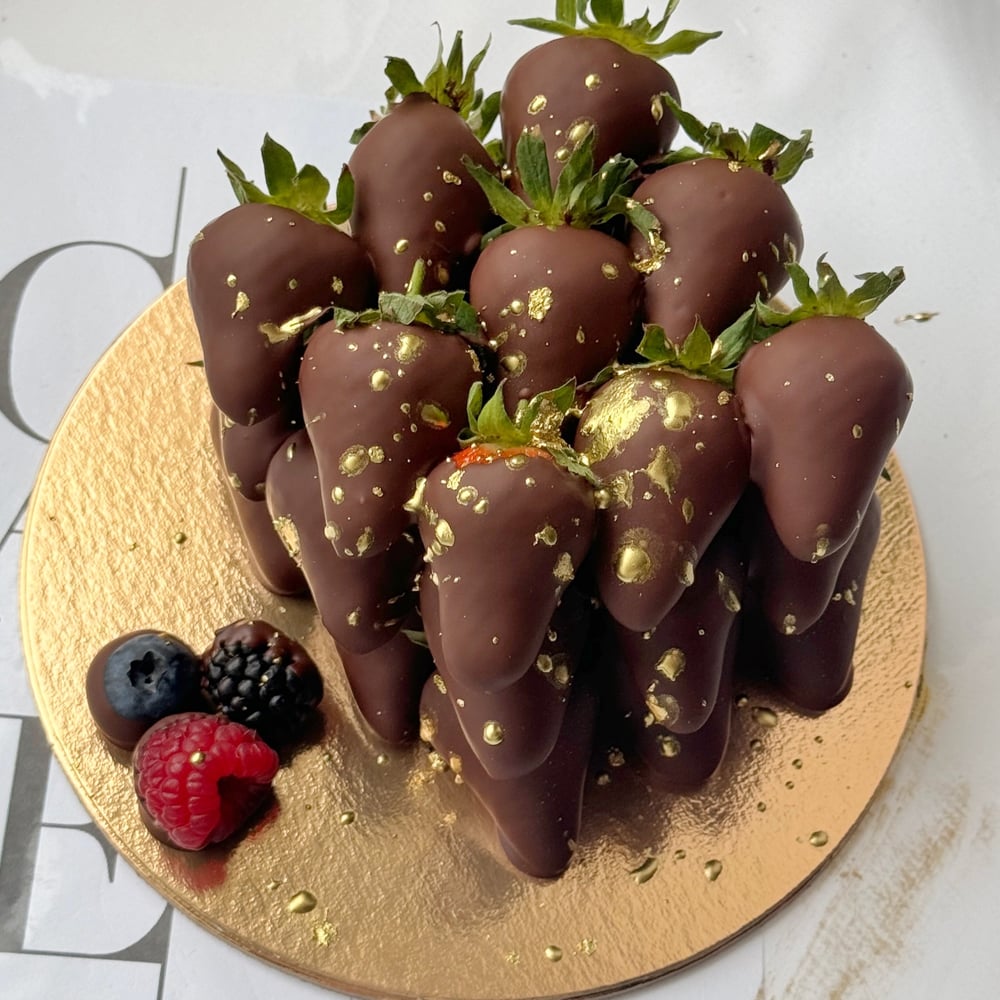 Торт из свежей клубники в бельгийском шоколаде. Тёмный шоколад и блики золота. Можно исполнить в молочном/белом/розовом шоколаде. А вы только взгляните на этот разрез. Ммм фото с ароматом настояще...