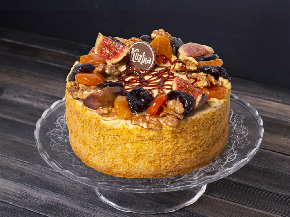 Медовый бисквит с черносливом, грецким орехом, курагой и финиками, пропитанный сметанным кремом с вареной сгущенкой и медовым сиропом