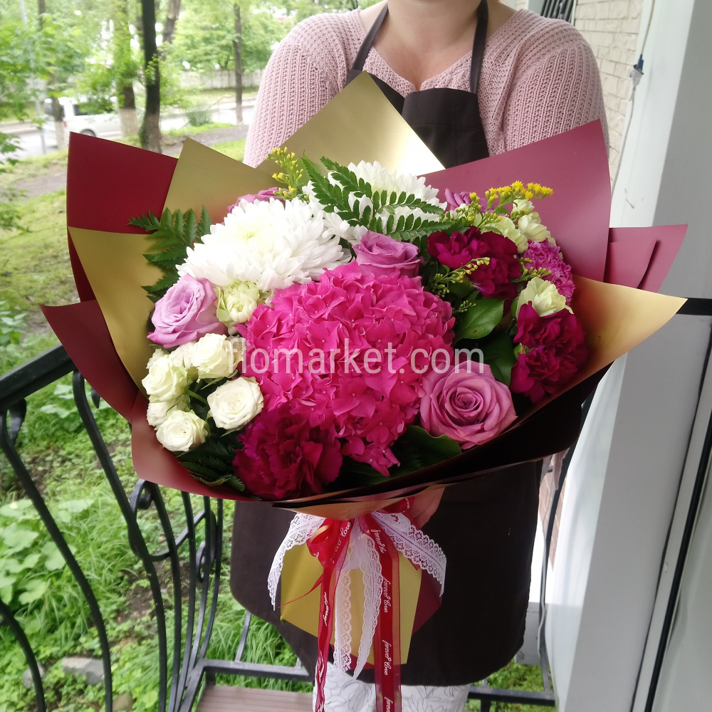 Яркий, презентабельный букет во главе с шикарной малиново гортензией. Такой букет придаст нотку торжественности и изыска.