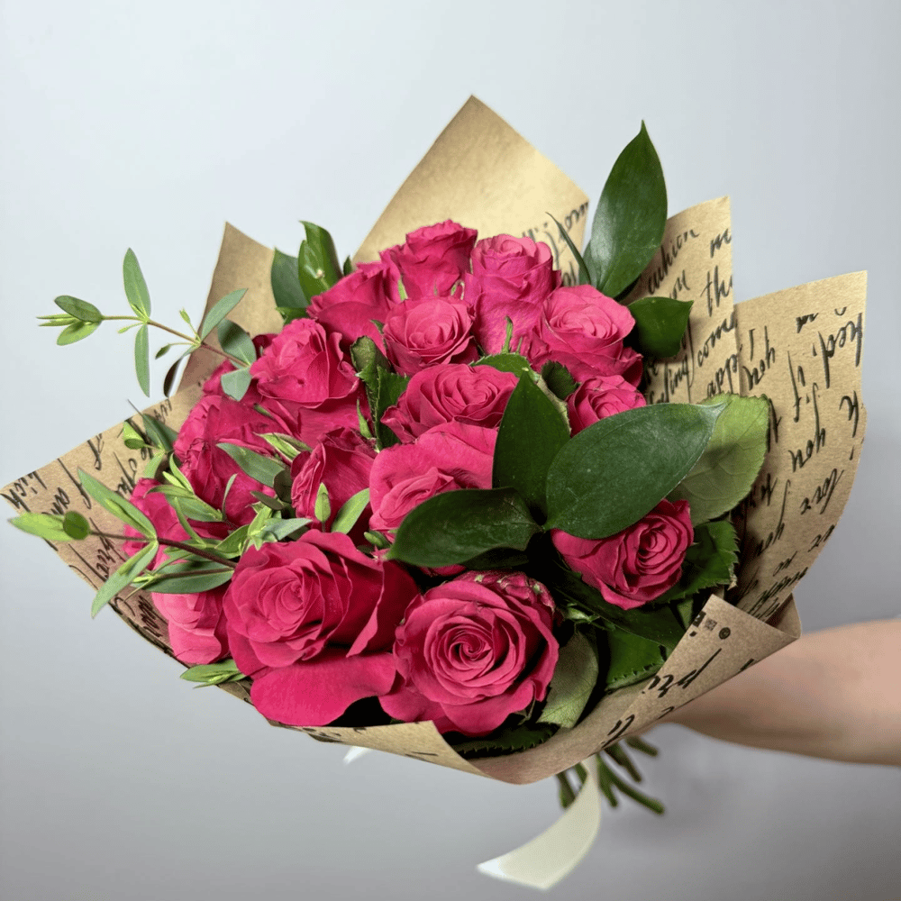 19 роз цвета фуксия с эвкалиптом. краытовая упаковка подчеркивает. солидность и самодостаточность букета. яркий, сочный, ягодный цвет вызывает радостные эмоции.