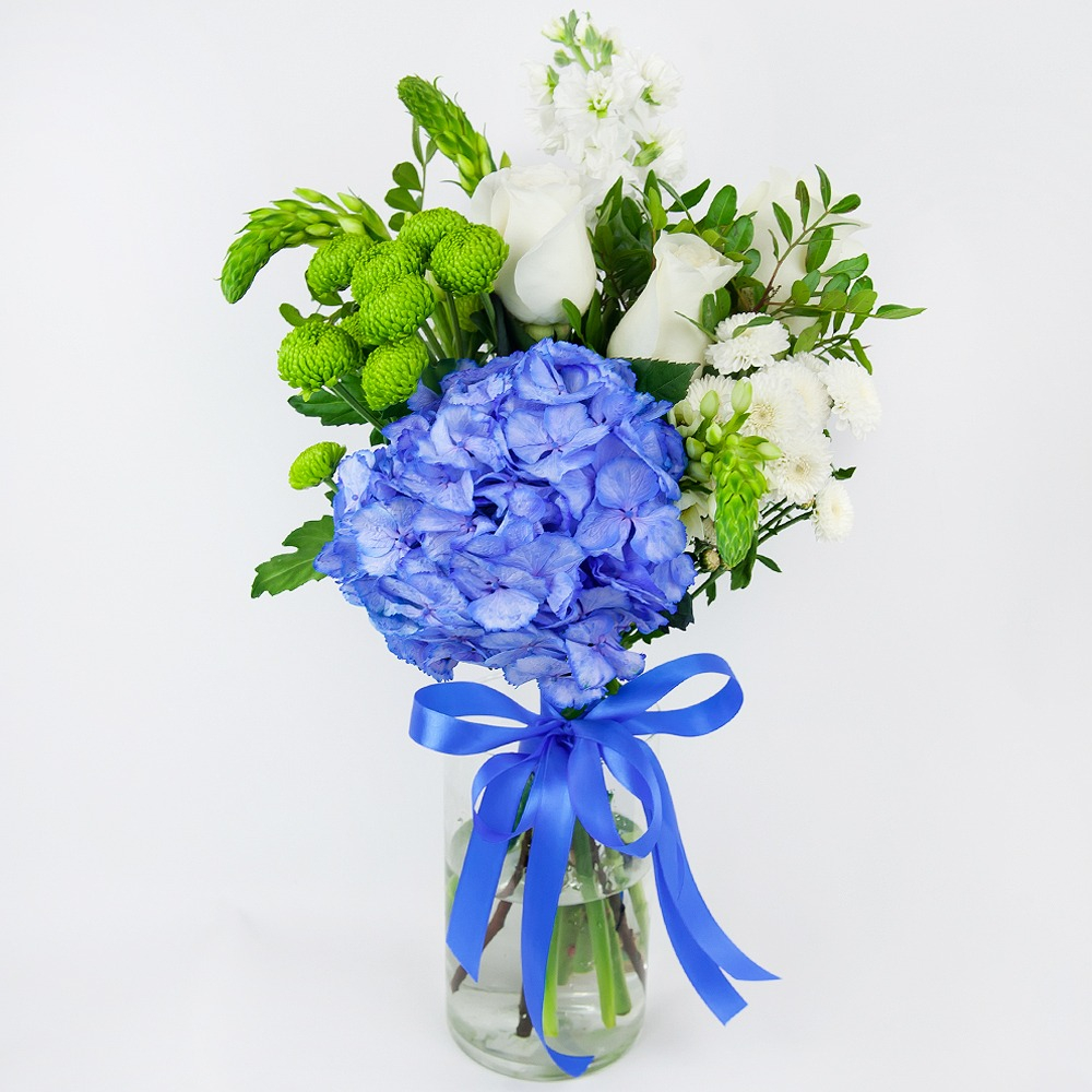Траурный букет: гортензия, розы и хризантемы