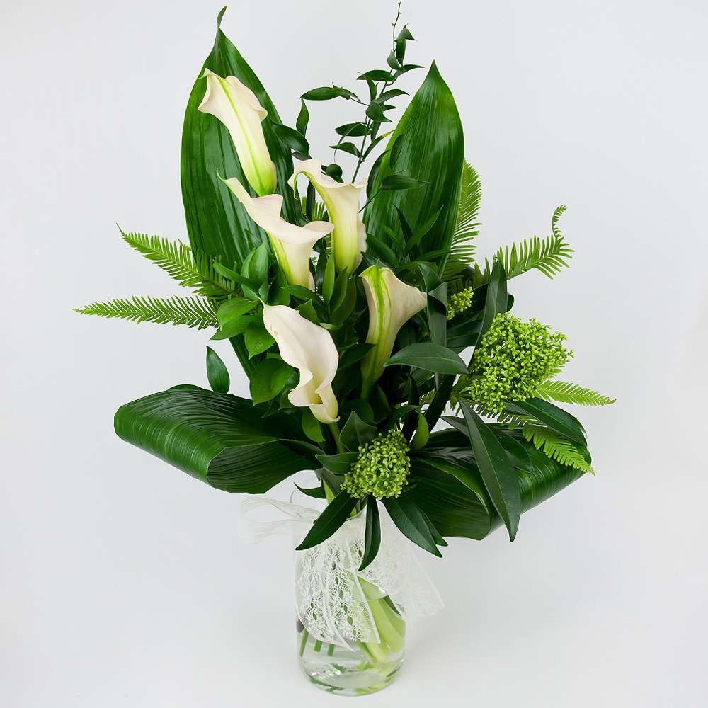 Букет из нарядных калл поможет почтить память ушедшего человека.