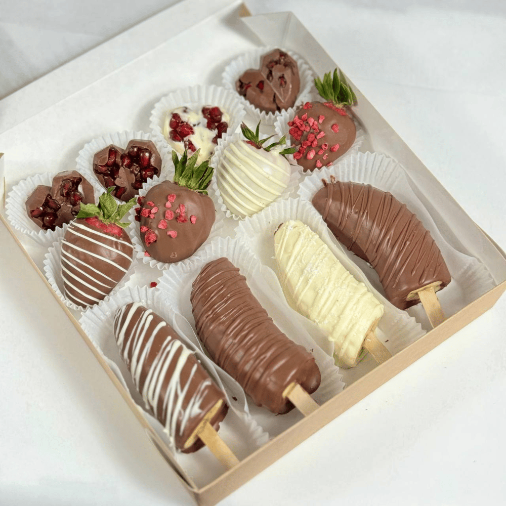 Позвольте себе всё и сразу! В этом наборе мы собрали идеальное трио: сочную клубнику, нежный банан на палочке и эксклюзивные шоколадные сердца с рубиновыми зернами граната. Разнообразие текстур — от…