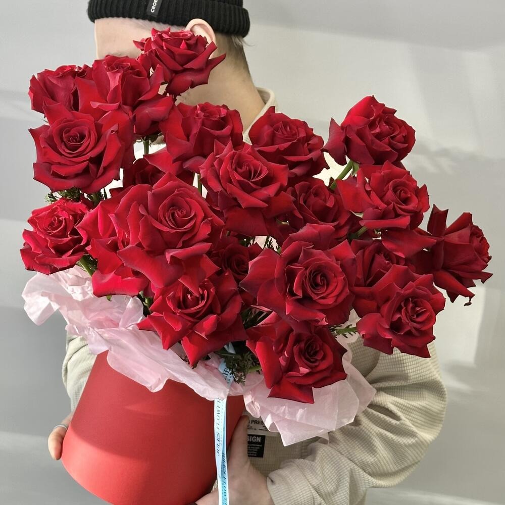 Шляпная коробка с цветами «Целестина 25 красных французских роз»