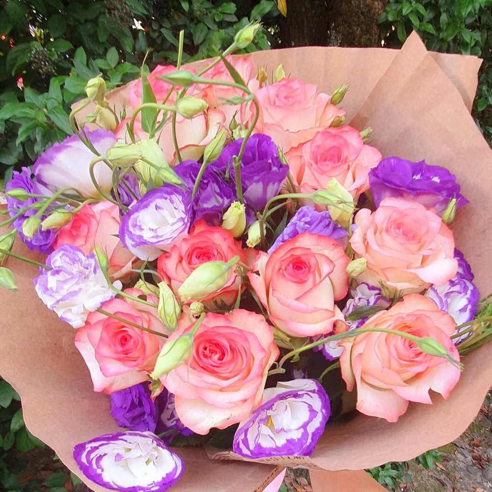 Яркий летний букет из роз и эустомы будет идеальным подарком для любого праздника или особого случая. Этот букет станет украшением интерьера и подарит радость и восторг получателю.