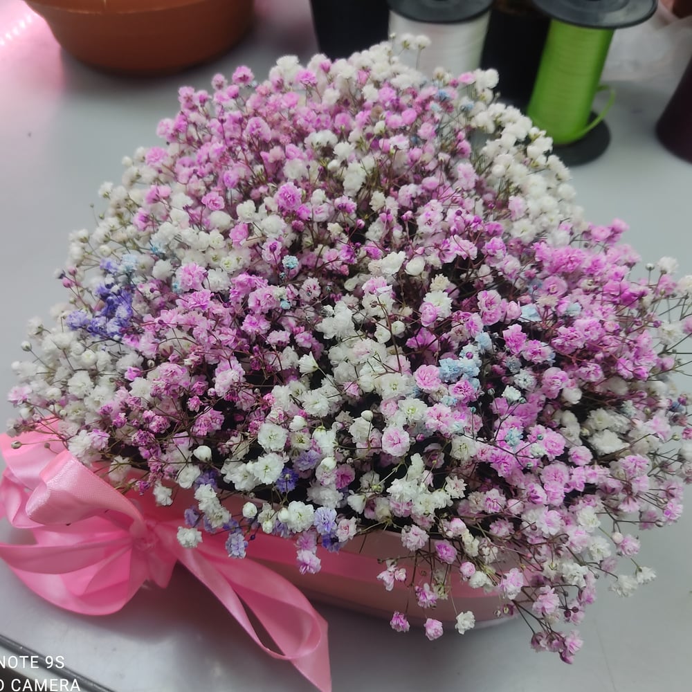 Коробка с цветами «Цветочная композиция "Радужное сердце"» из гипсофил