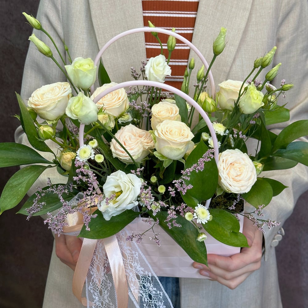 Коробка с цветами «Цветочная композиция в сумочке» из роз и эустом