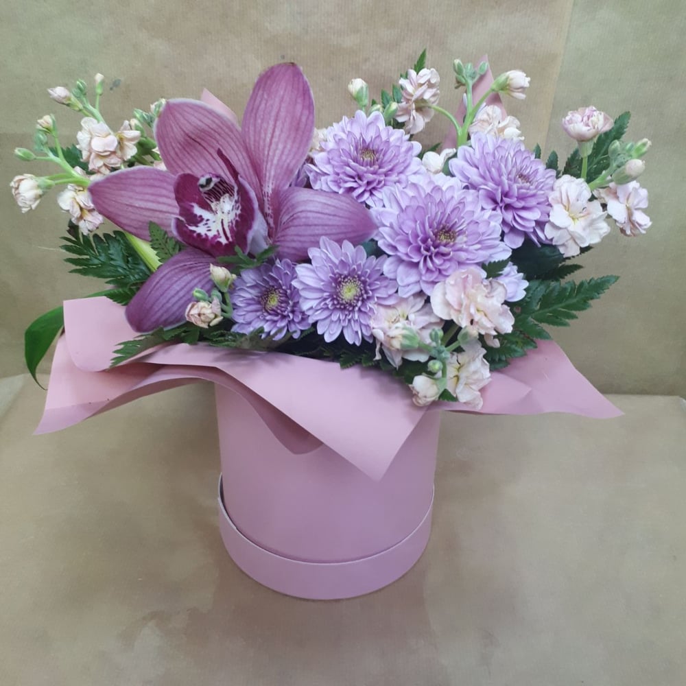 Шляпная коробка с цветами «Цветочная коробочка» из экзотических цветов и роз