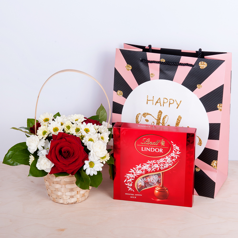 Праздничная композиция из роз, хризантем, гвоздик и зелени салала в корзине, идеально дополняет изысканные конфеты, упакованные в подарочный пакет. Композиция прекрасно подходит не только для праздников, но и для того, чтобы сделать каждый день особенным.