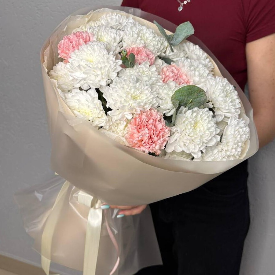 Нежный букет из белых кустовых хризантем с акцентами из нежно-розовых гвоздик. Дополнен свежей зеленью, аккуратно упакован в полупрозрачную бежевую бумагу и перевязан лёгкой лентой. Выглядит изысканн…