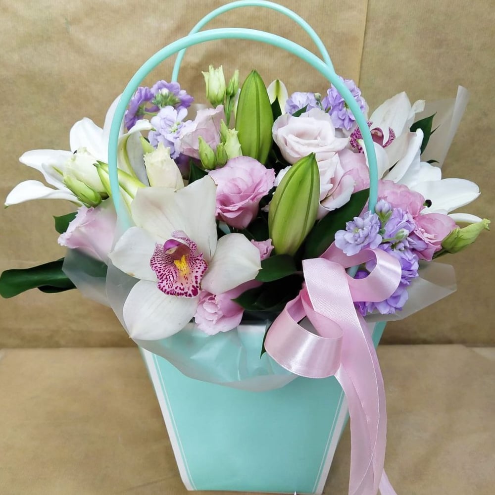 Коробка с цветами «Цветочная сумочка» из орхидей и эустом