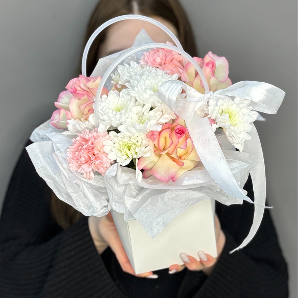Коробка с цветами «Цветочная сумочка» из гвоздик и хризантем