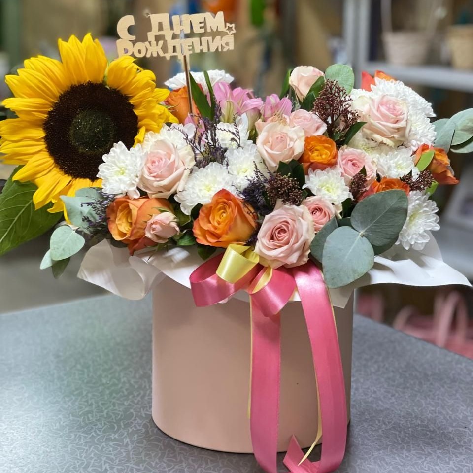 Шляпная коробка с цветами «Цветочный карнавал» из роз и хризантем