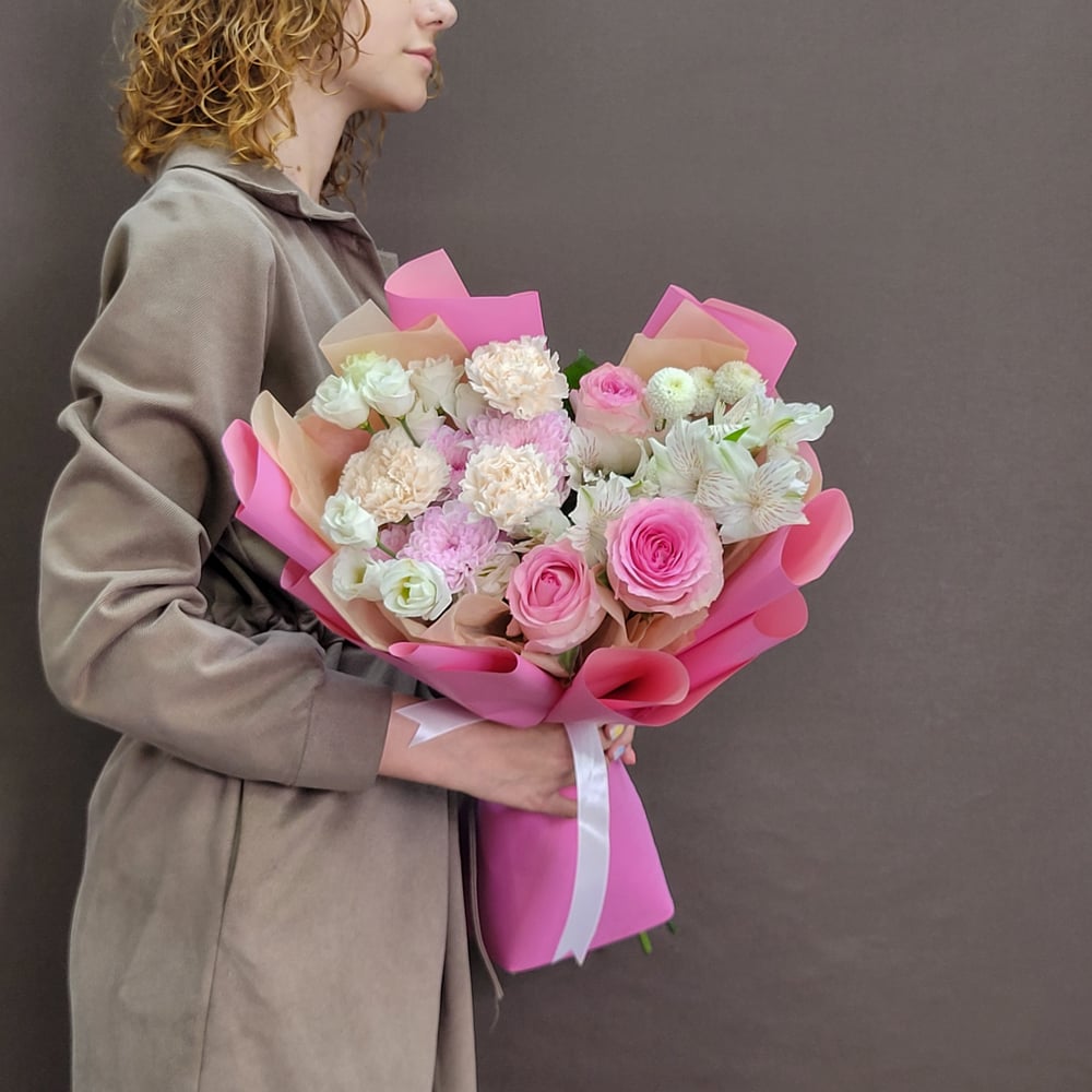 Букет из розовых роз и диантусов "Цветочный Коктейль" - это сборный букет, который станет отличным подарком для любого повода. В его состав входят разнообразные цветы, такие как альстромерия, роза,...
