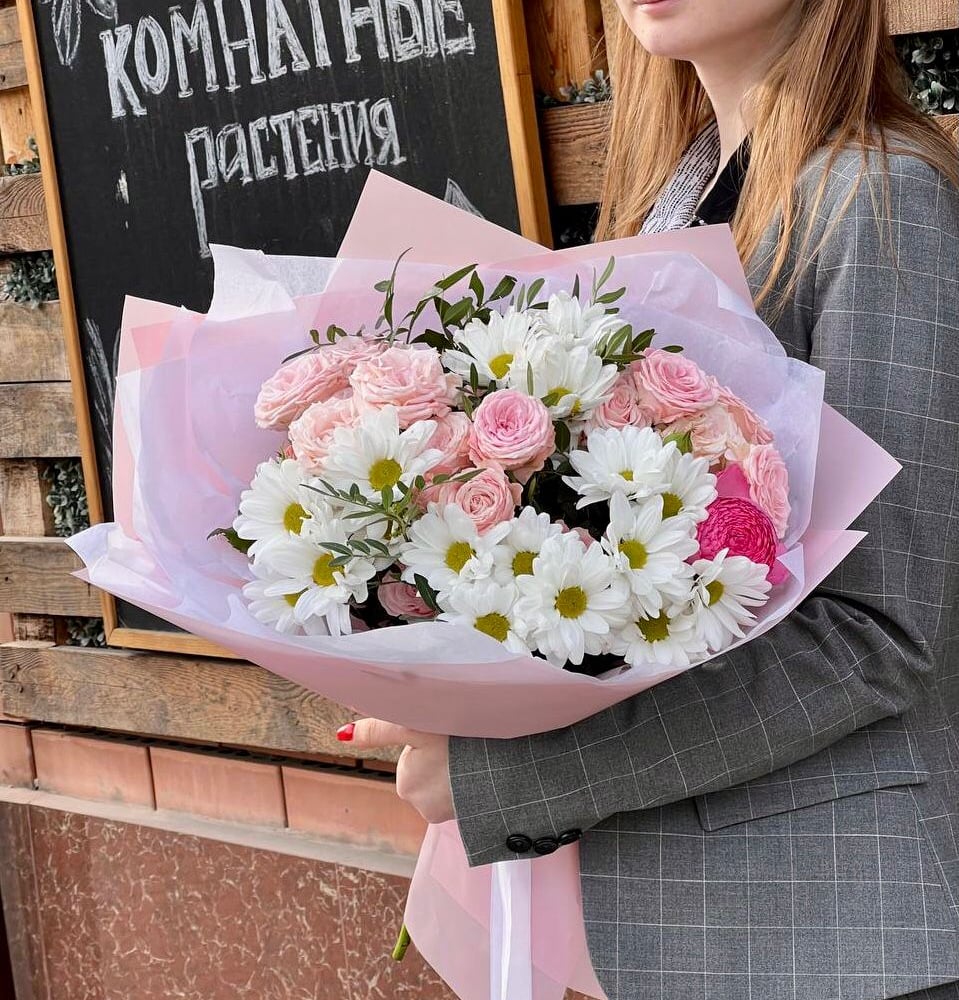 Воздушный букет из крупных одноголовых и кустовых хризантем!
