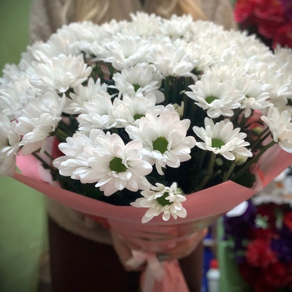 Букет белоснежных кустовых хризантем, 7 шт. Упакован в матовую пленку, зафиксирован атласной лентой. Стойкие хризантемы будут радовать получателя долгое время. Букет подойдет для любого повода