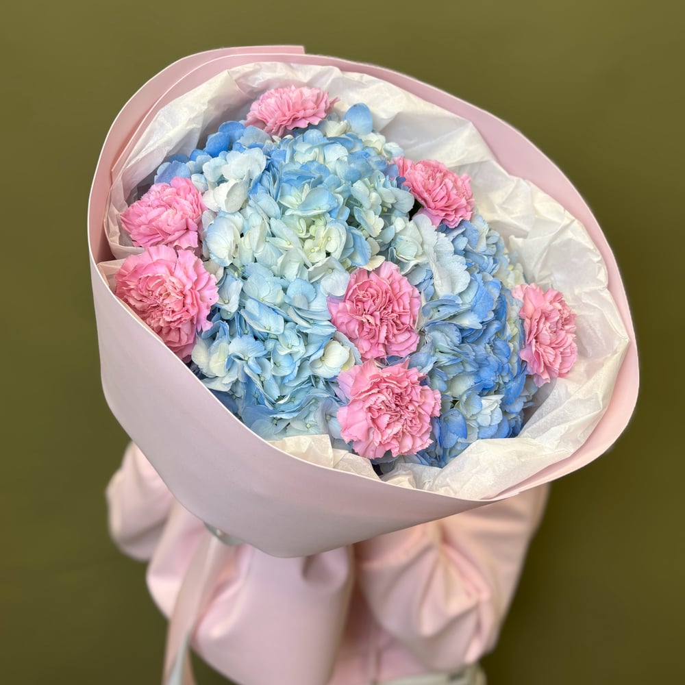 Букет «Цветочный вальс» из гвоздик и гортензий