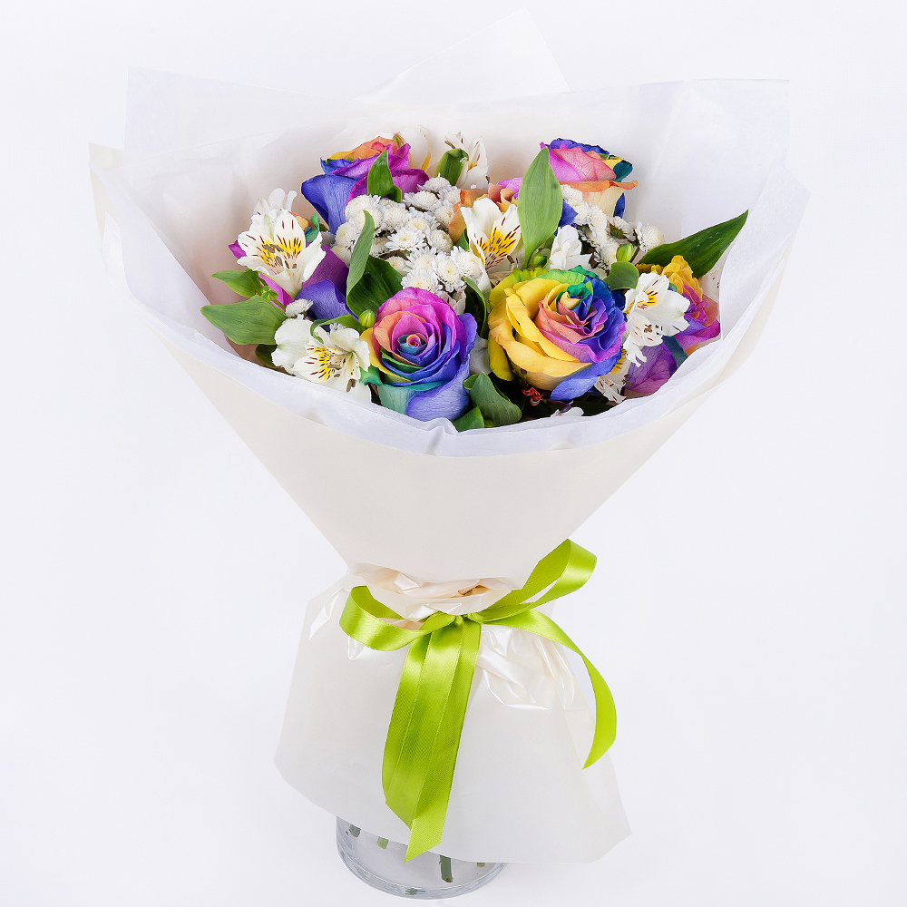 Букет «Цветущая красота» — это воплощение нежности и разнообразия, которое подарит получателю ощущение радости и восхищения. В этом букете гармонично сочетаются радужные розы, альстромерии и кусто...