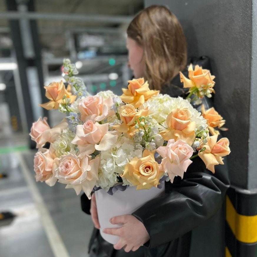 Шляпная коробка с цветами «Цветущие миры» из роз и экзотических цветов