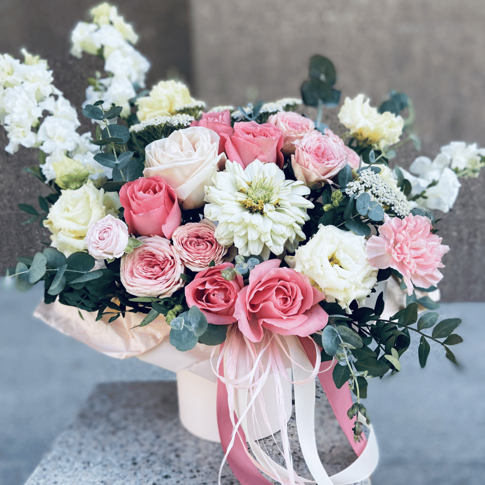 Шляпная коробка с цветами «Цветв в коробке Романтика Июня» из роз