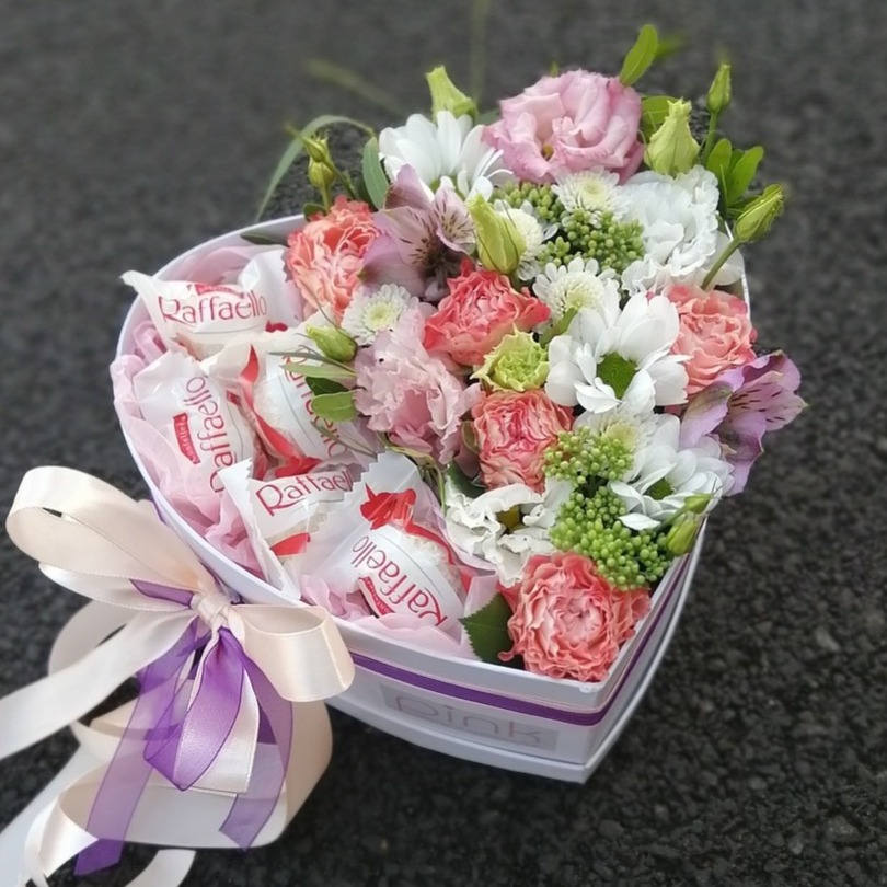 Сборная коробка цветов с нежным и хрустящим Рафаэлло.