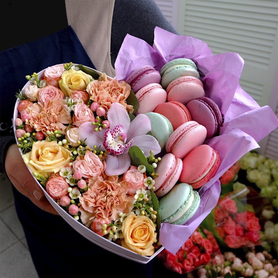 Композиция из цветов и миндальных пироженных Макарон, собранная в коробке-сердце, символ нежной любви и заботы. Дарите незабываемые эмоции и улыбки !