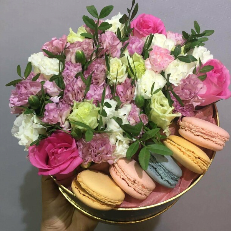 Шляпная коробка с цветами «Цветы в коробке» из эустом и роз
