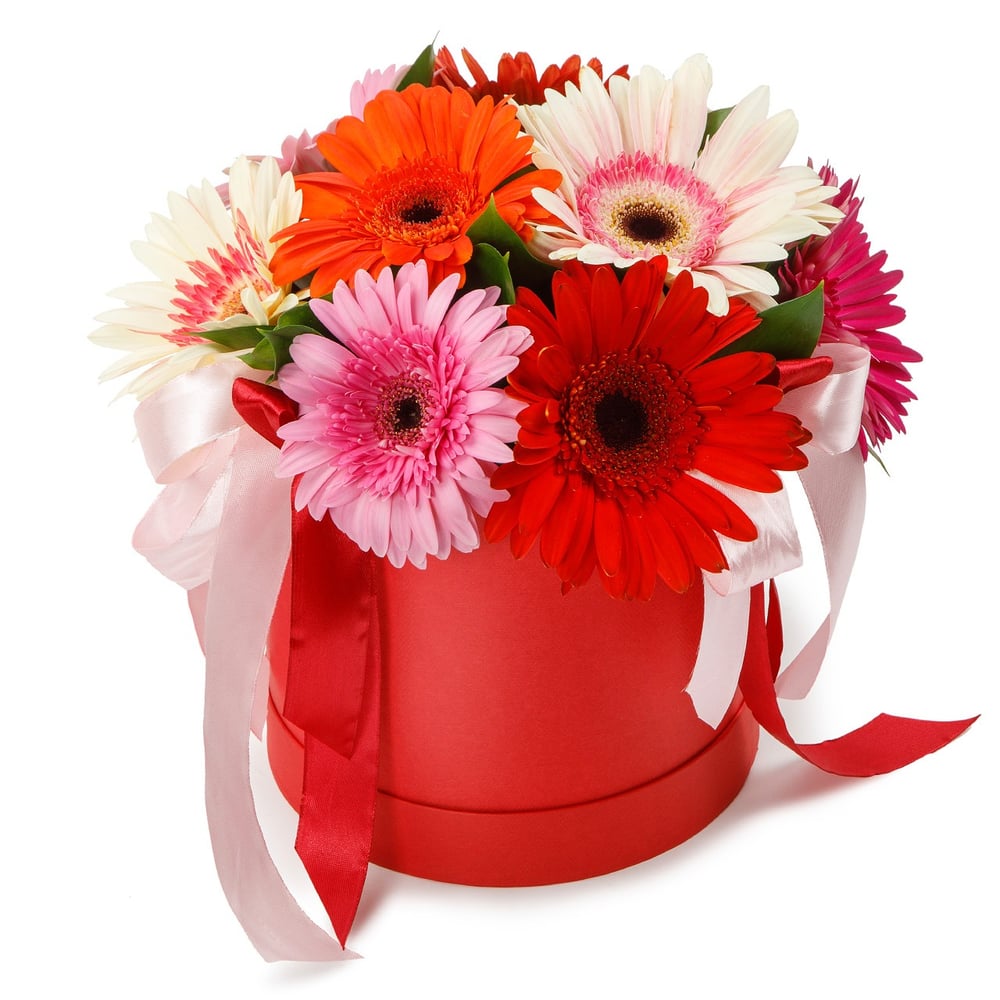 Разноцветный ансамбль из 9 гербер - это пожелание счастья, радости, благополучия, улыбок и позитива! Сочная красочная цветочная композиция в шляпной коробке подарит яркие и положительные эмоции!