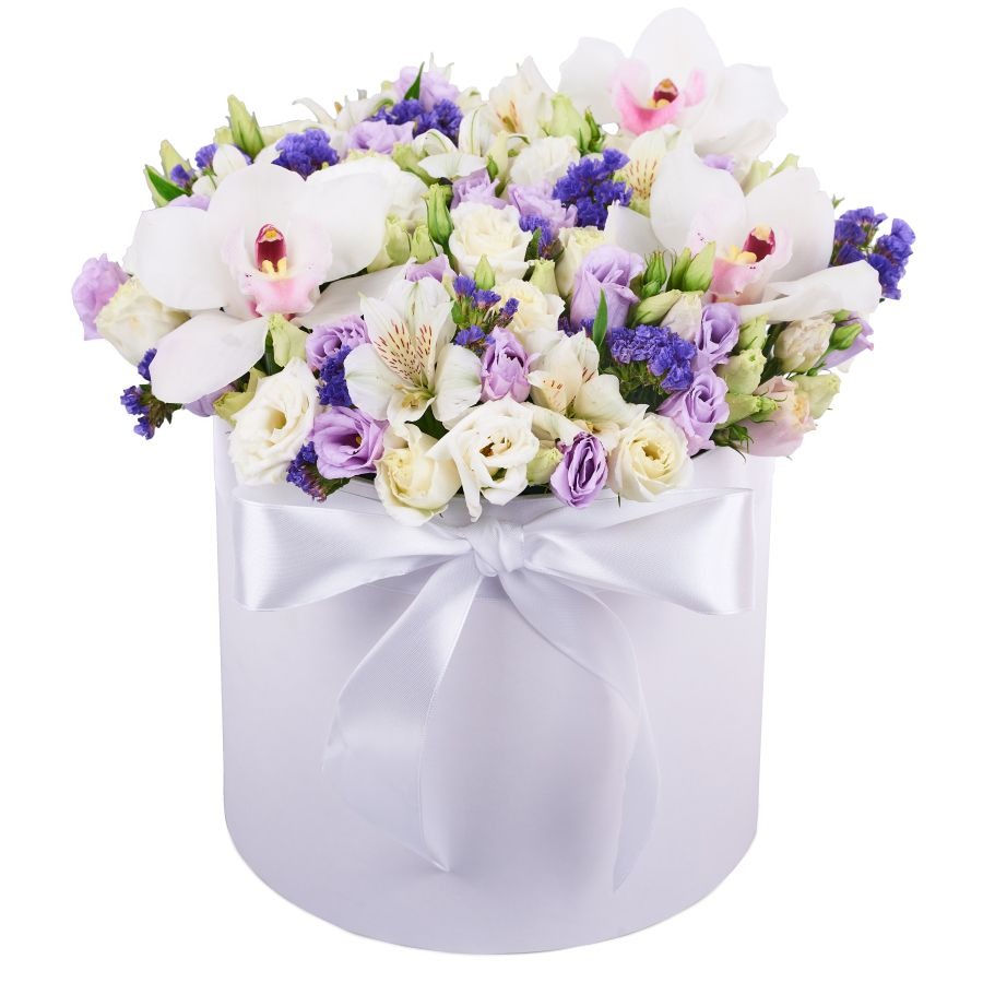 Шляпная коробка с цветами «Цветы в коробке "Клевер любви" Премиум» из эустом и альстромерий