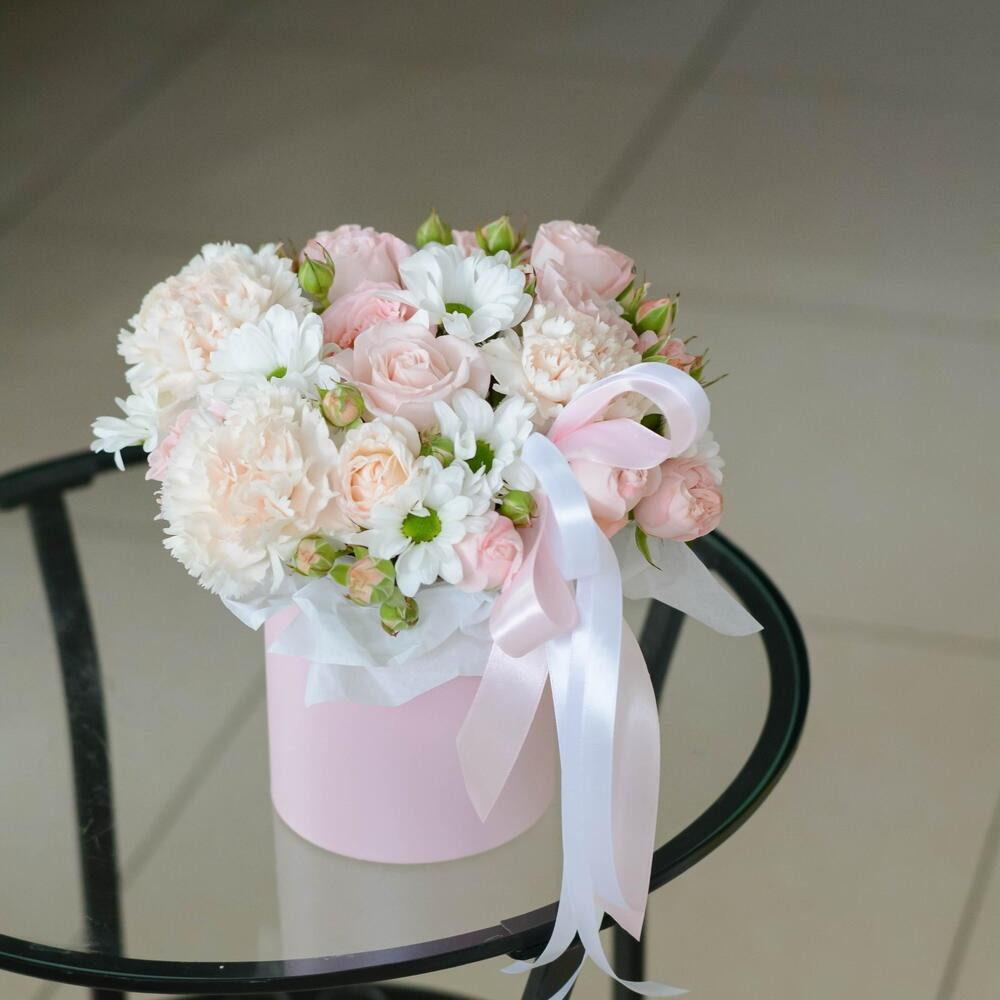 Нежная композиция в светлых оттенках, а также с потрясающим ароматом в стильной шляпной коробке - это практичный и интересный подарок для любого праздничного события. В дополнении к нашим букетам и...