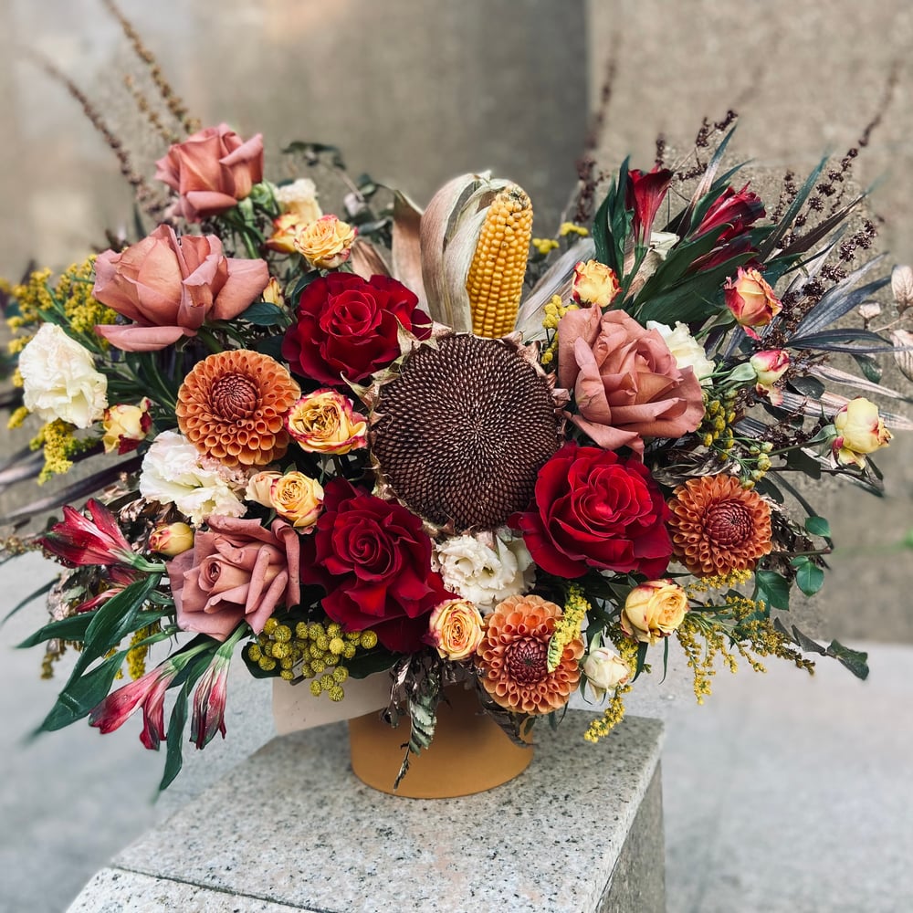 Шляпная коробка с цветами «Цветы в коробке Краски щедрой осени» из роз и эустом