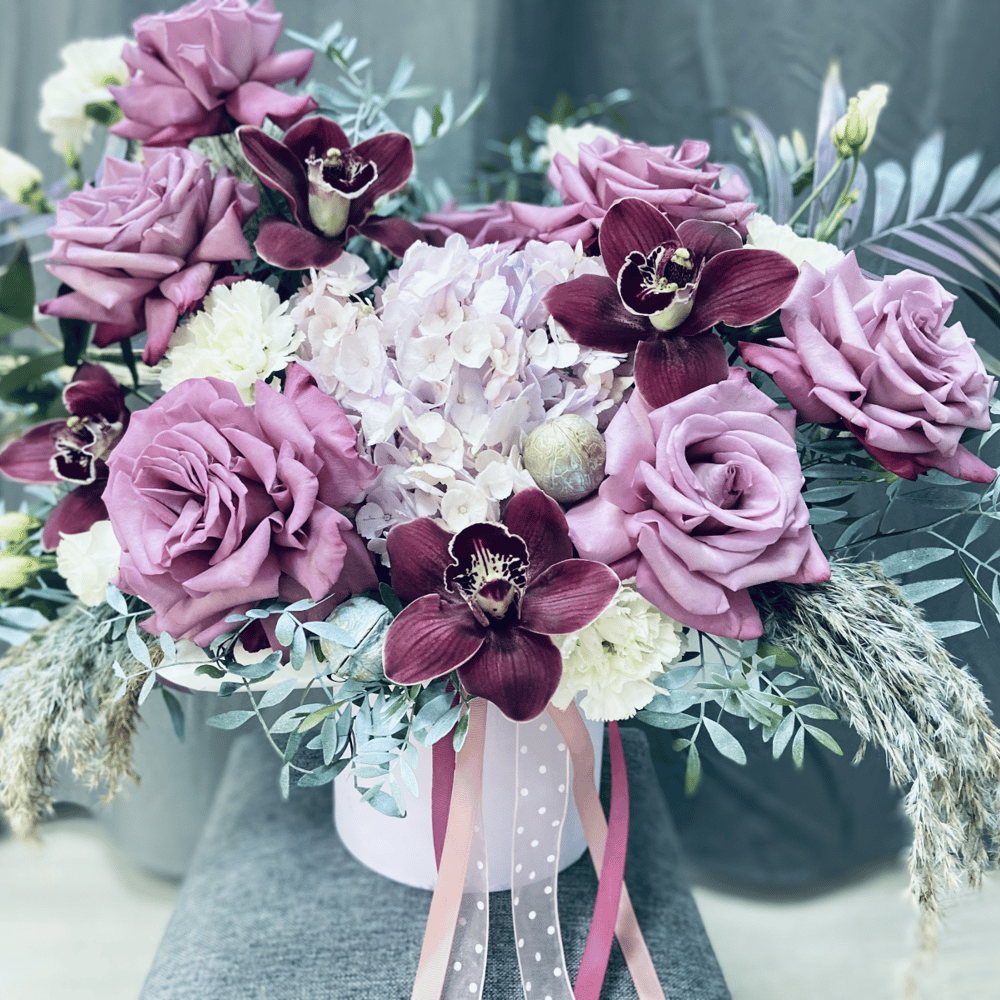 Шляпная коробка с цветами «Цветы в коробке Лиловый восторг» из роз и гвоздик