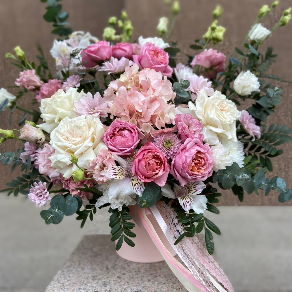 Шляпная коробка с цветами «Цветы в коробке Нежность весны» из эустом и роз