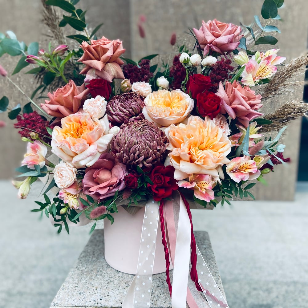 Шляпная коробка с цветами «Цветы в коробке Осенний вальс» из альстромерий и роз
