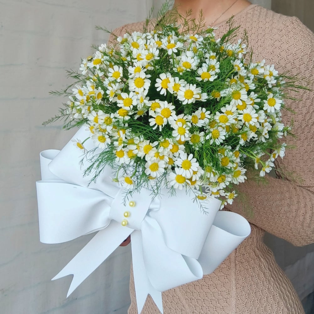 Предляем вашему вниманию удивительный букет из кустовых ромашек, аккуратно оформленный в стильной шляпной коробочке с дизайнерским бантом! 🌼✨ Этот изысканный подарок — символ нежности и чисто...
