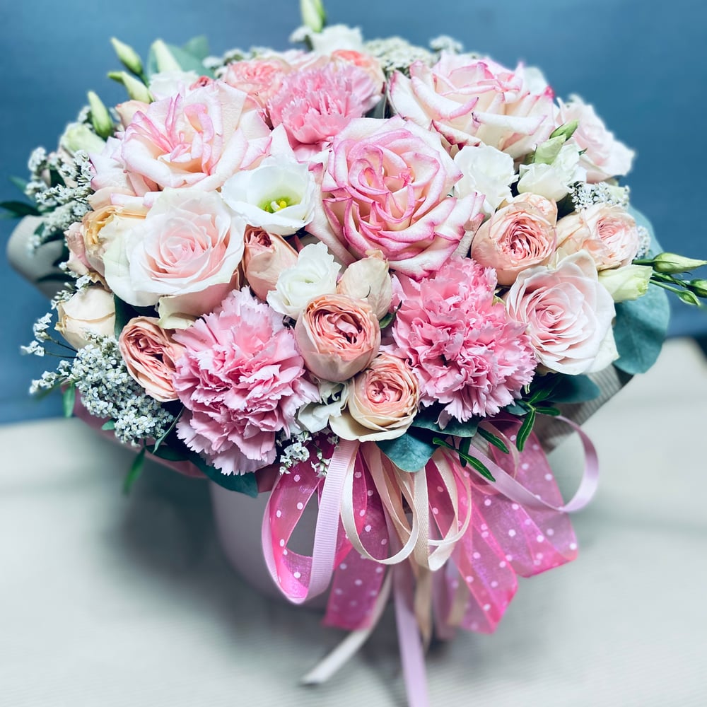 Невероятно нежная Еомпозиция в бело-розовой Гамме с кустовыми пионовидными розами, диантусами и кружевными розами палома , покорят сердце самой нежной принцессы
