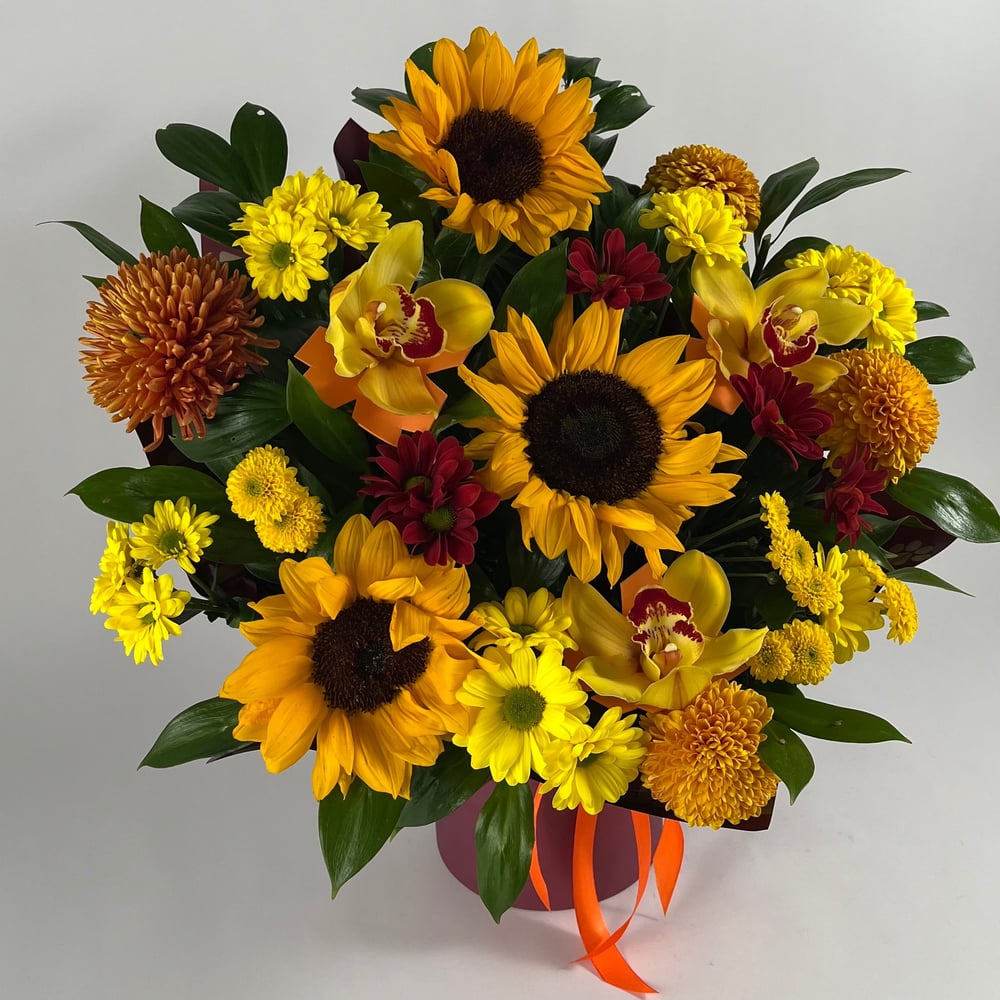 Шляпная коробка с цветами «Цветы в коробке Солнечный День в Ноябре» из хризантем и подсолнухов