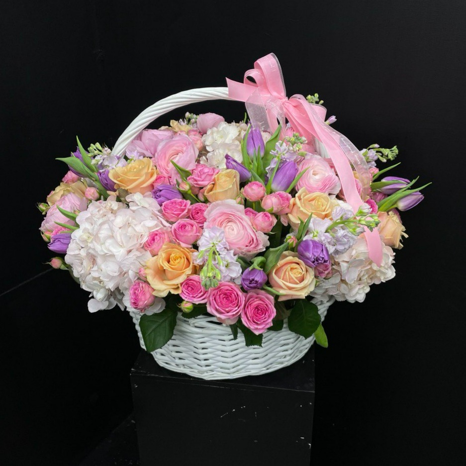 Цветы в корзине "Нежные признания" из роз и тюльпанов