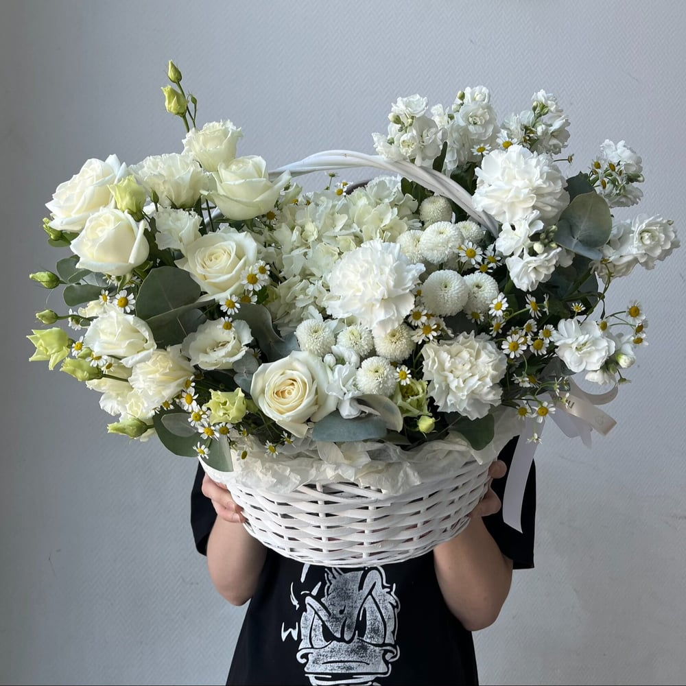 Представляем вашему вниманию изысканную корзину, наполненную ароматными цветами в белой гамме — идеальный подарок для любого торжества или важного события. Эта композиция станет настоящим символом элегантности и утонченности. - Белые розы: Символ любви и чистоты, эти цветы добавляют романтический акцент и создают атмосферу нежности. Их великолепные бутоны излучают мягкий аромат, наполняя пространство свежестью. - Ромашки: Эти простые, но такие милые цветы придают композиции игривость и легкость. Их белоснежные лепестки контрастируют с яркими сердцевинами, создавая гармоничное сочетание. - Гортензия: Их нежный оттенок прекрасно дополняет общую палитру и создает ощущение воздушности. - Идеальный подарок: Эта корзина станет великолепным подарком на свадьбу, юбилей, день рождения или в качестве знака внимания для близких людей. - Эмоциональная ценность: Цветы в белой гамме символизируют чистоту намерений и искренние чувства, что делает подарок особенно значимым. - Долговечность: Благодаря правильному уходу, цветы сохранят свою свежесть и красоту на протяжении длительного времени, радуя глаз и поднимая настроение.