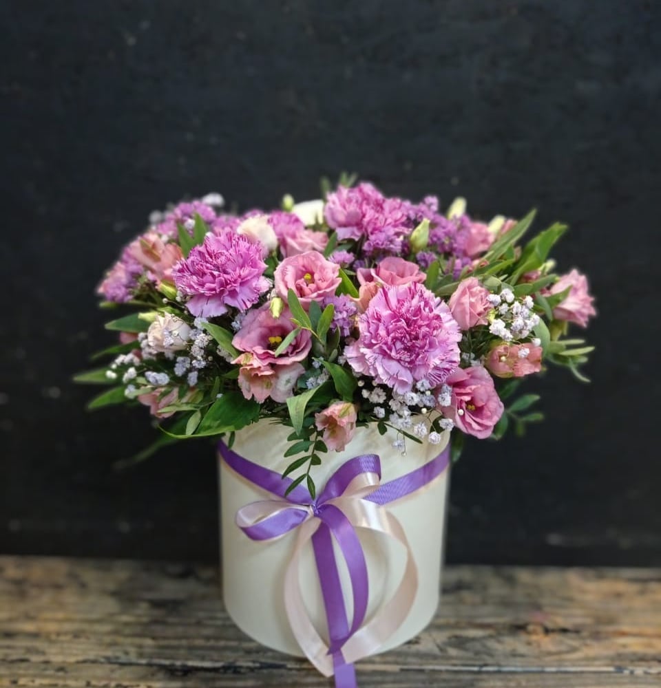 Цветы в шляпной коробке из гвоздик и альстромерий