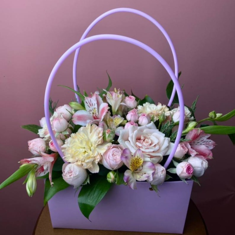 Композиция «Цветы в сумке» из роз и альстромерий